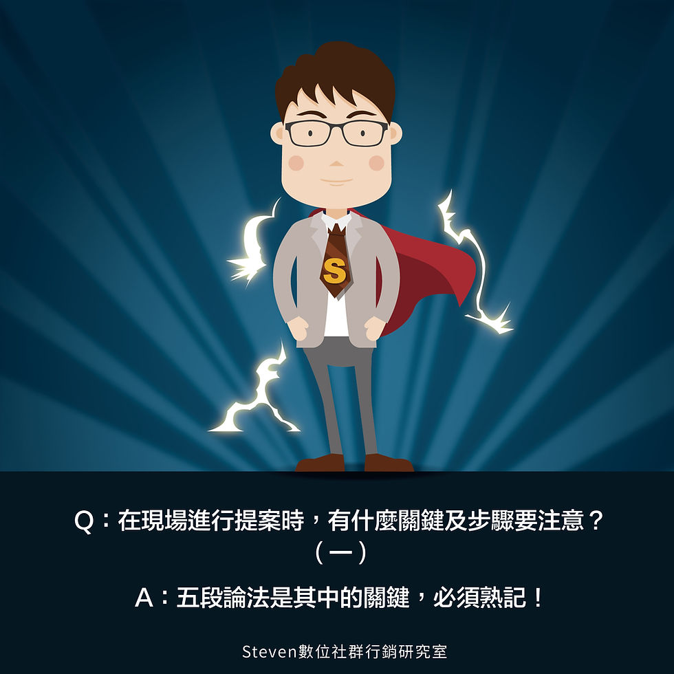 【#Steven的社群小教室-歡迎大家發問】 Q:「老師,在現場進行提案時,有什麼關鍵及步驟要注意?(一)」 我:這個問題當中,有很多眉眉角角要注意! 我曾經在一個大廣告公司中上過國際分享課程,內容是由幾位提案之神教大家如何提案並成功拿下案子。 我覺得很有趣!而接下來我也要分享「五段論法」。 這五個很重要的步驟,分別為「破冰」、「目標」、「策略」、「創意」、「作法」。 我們打破冷落的感覺後,氣氛越熱絡,越容易成案,因此「破冰」是必備的。 我們的創意再好玩、提案的再好,目標如果忘了就白費了。因此「目標」也是關鍵之一。 提案著重在關鍵點上,是「策略」的一環。如果我們有好的破解之道,也就有好的策略之術。 讓消費者迫切地想要接收的亮點,就是「創意」的所在。 最後,具體的「作法」,明確的步驟與SOP,可以讓提案對象知道大概的作法,並認為是可行的。